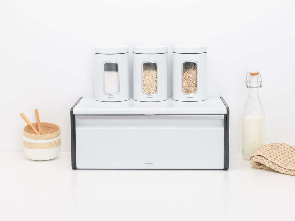Our Fall front bread bin has a flat top, so you can store canisters etc. on top of it. Plus it keeps all your bread fresh because of its good closure: the fall font lid is fitted with a magnetic seal.