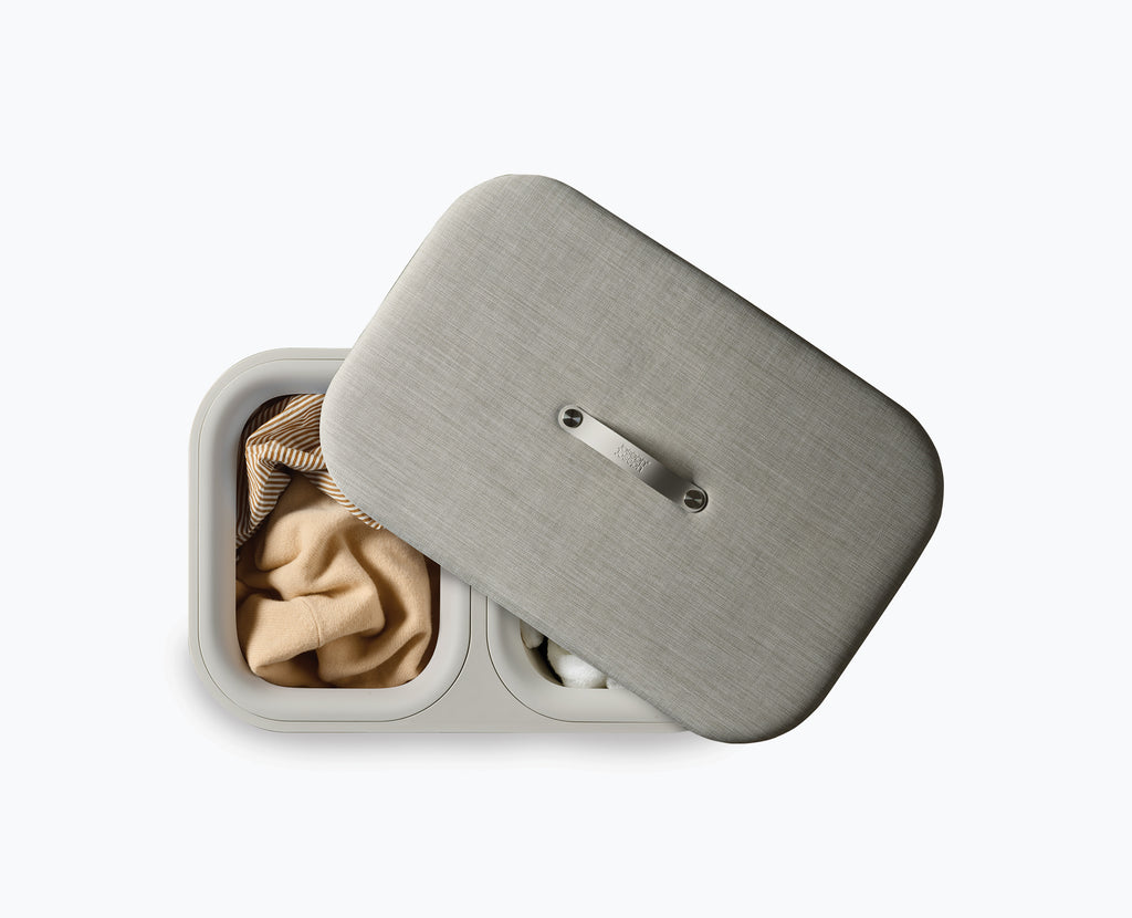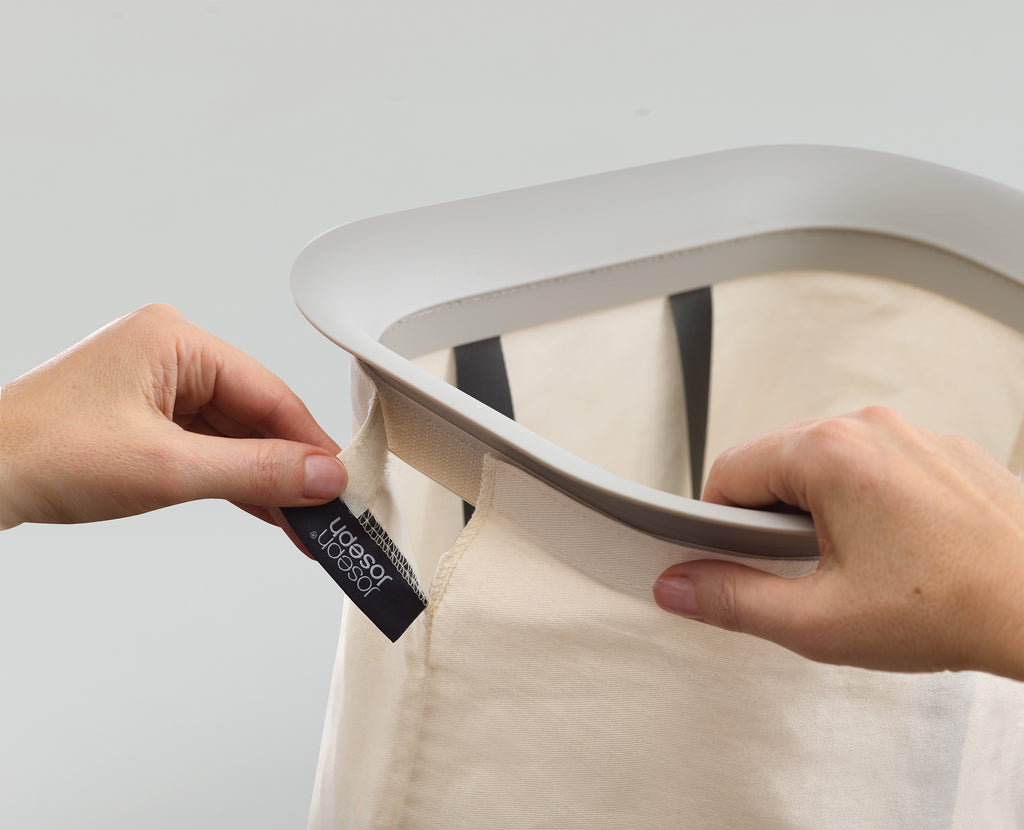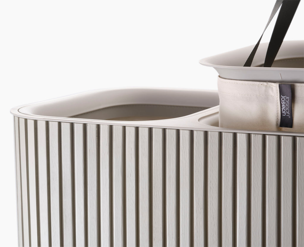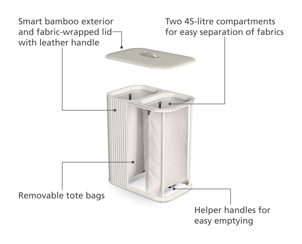 Elevate your laundry routine with this sleek ecru bamboo basket featuring two 45L fabric bags for easy sorting and carrying. Stylish and functional, it fits beautifully in any bedroom decor.
