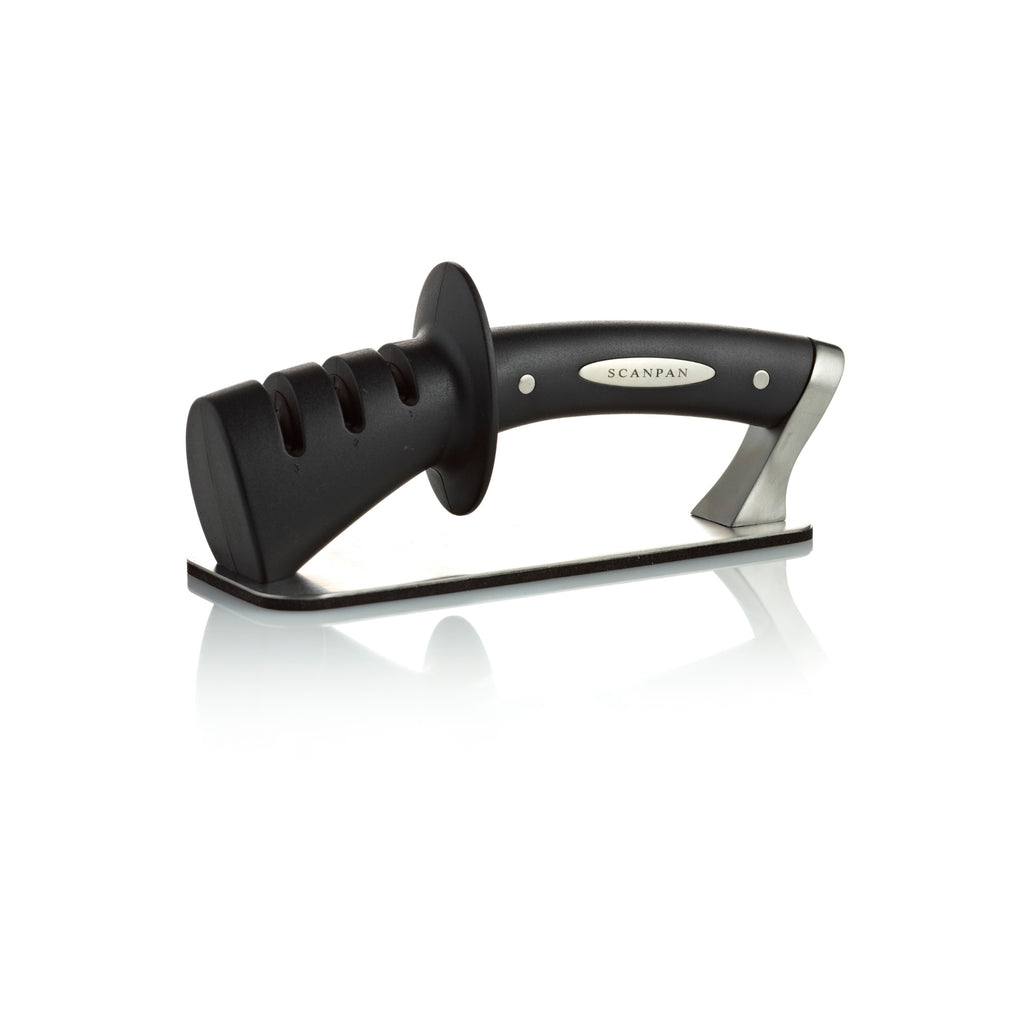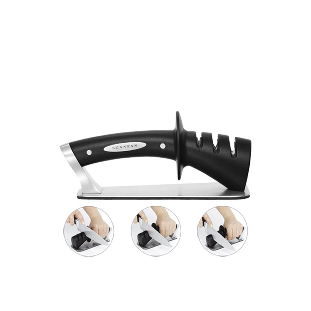 - 3-Step Sharpening System – The Scanpan New Classic Knife Sharpener utilizes a 3-step process to ensure optimal edge sharpening: