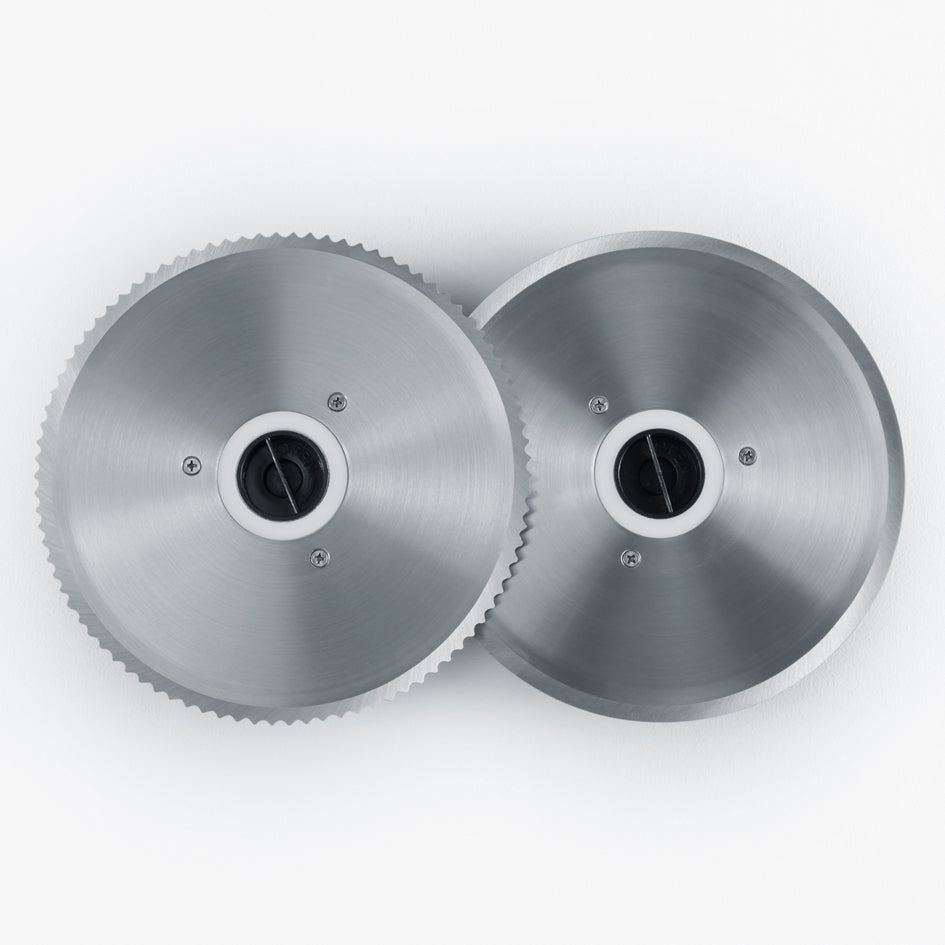 Through thick and thin with the universal cutter: adjustable cutting thickness from 0 to 15 mm; the item being cut remains constantly tilted for precise results. Motor casing, stop and base plate are made of robust metal; the stainless steel blades are removable for easy cleaning.